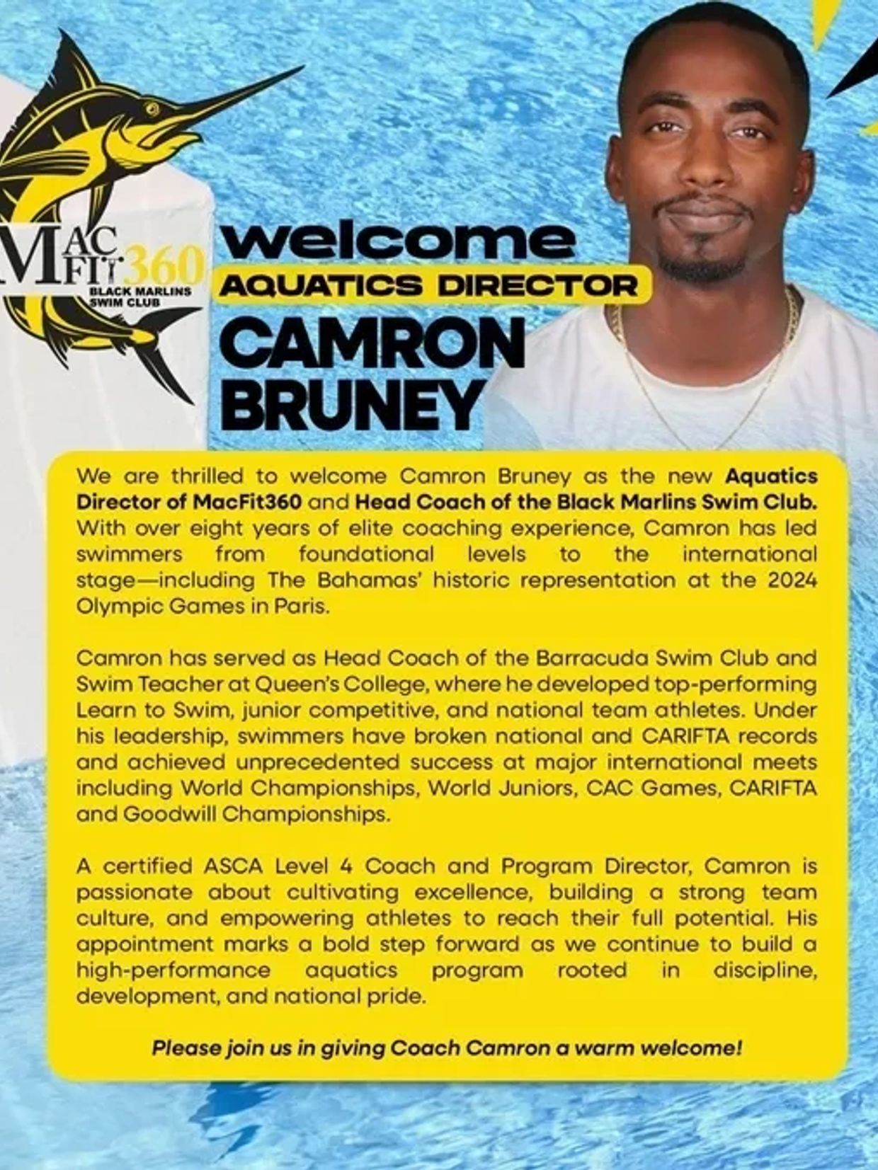 We are proud to officially welcome Coach Camron Bruney as our new Aquatics Director and Head Coach of the Black Marlins Swim Club.
